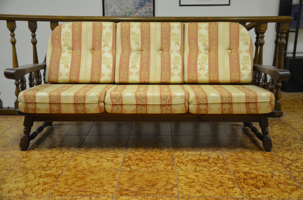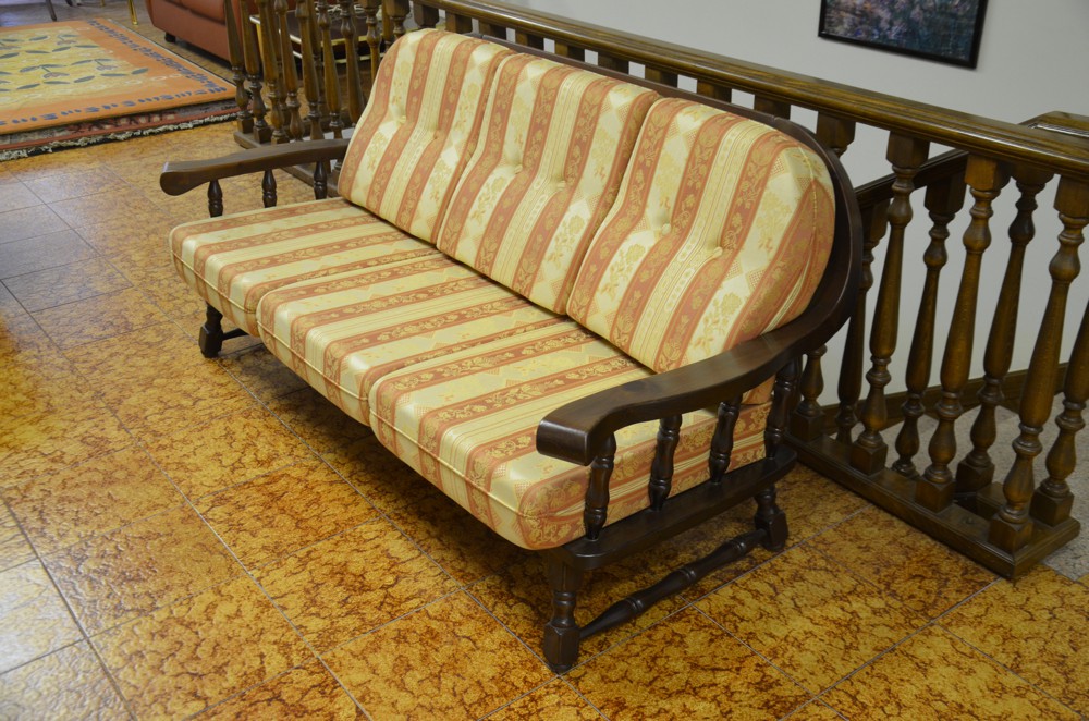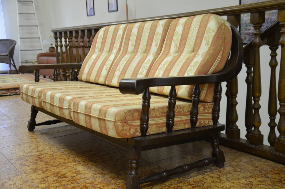 Divano 3 posti con struttura in legno rustico e sedute imbottite in tessuto.