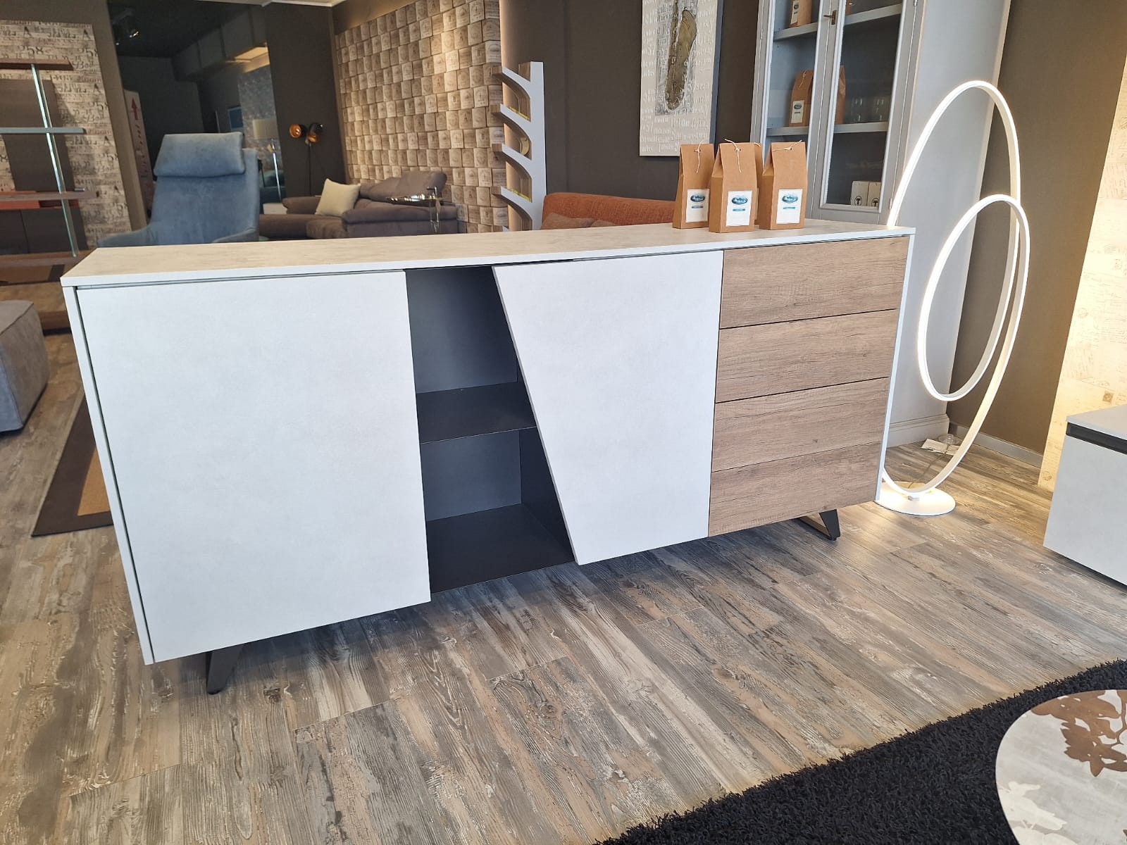 Finitura cemento chiaro, rovere nodato chiaro e metalli antracite