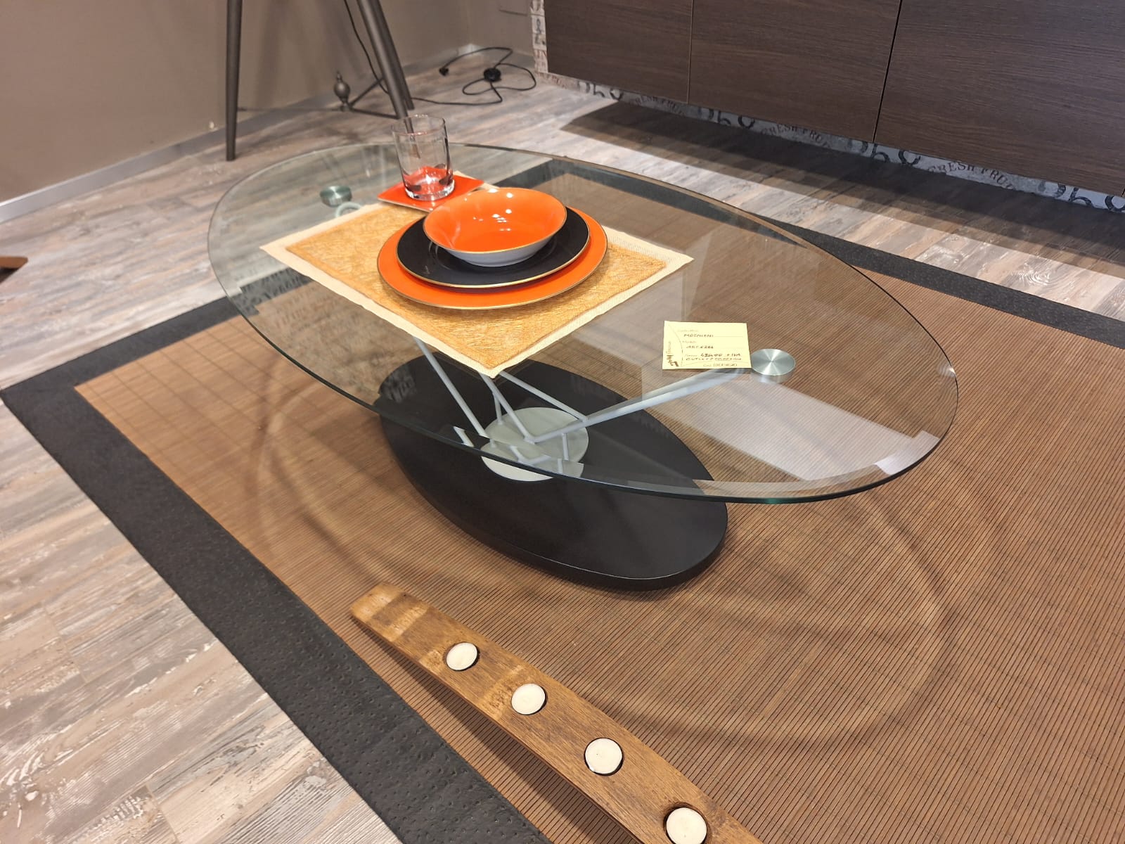 Tavolino ovale con basamento in legno finitura wengè e struttura in metallo